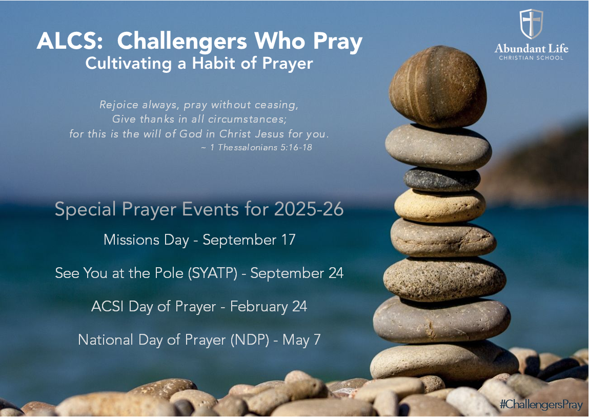 Prayer is an important part of our everyday life at ALCS. Three special events that highlight our emphasis on prayer are “See You at the Pole” each September, the Association of Christian Schools International's “Day of Prayer” in late February/early March, and the “National Day of Prayer” each May. We encourage students, staff, and parents to join together with Christians around the nation and/or world to impact our society for Christ through prayer.